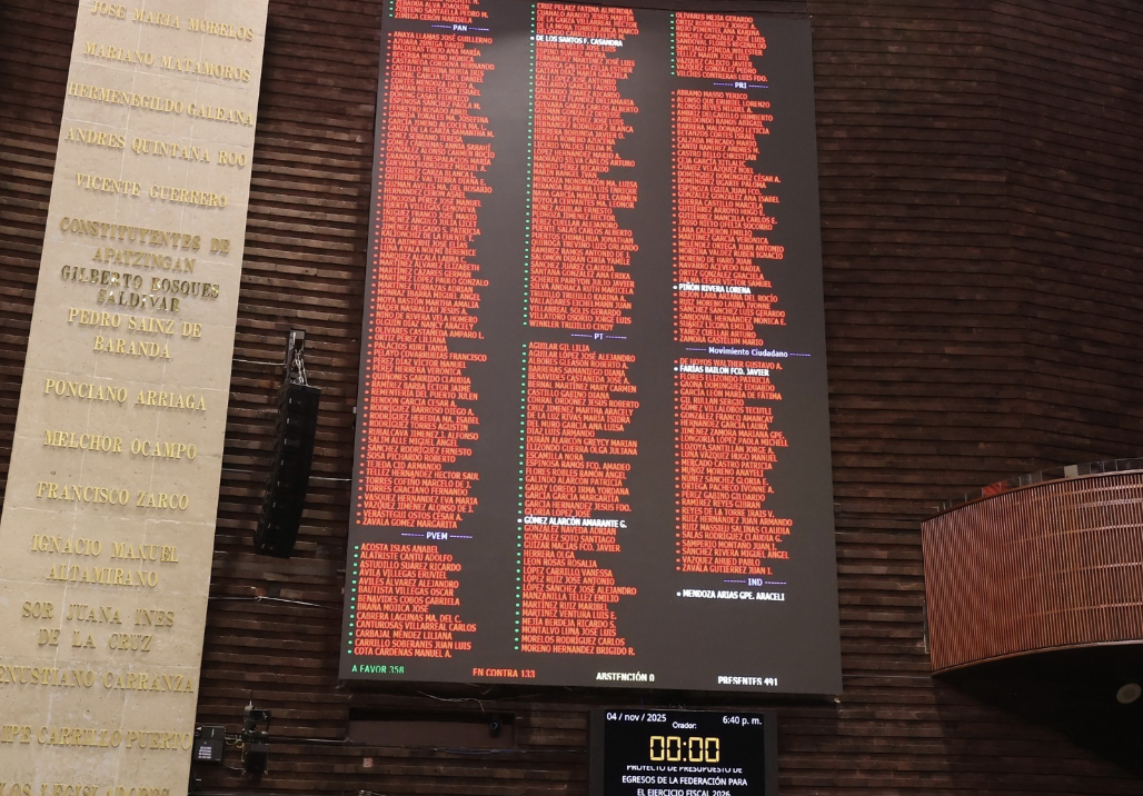 Con 358 votos a favor, 133 en contra y cero abstenciones, el Pleno de la Cámara de Diputados aprobó, en lo general, el dictamen con Proyecto de Presupuesto de Egresos de la Federación (PEF) para el Ejercicio Fiscal 2026, que contempla un gasto neto total de 10 billones 193 mil 683.7 millones de pesos (mdp).