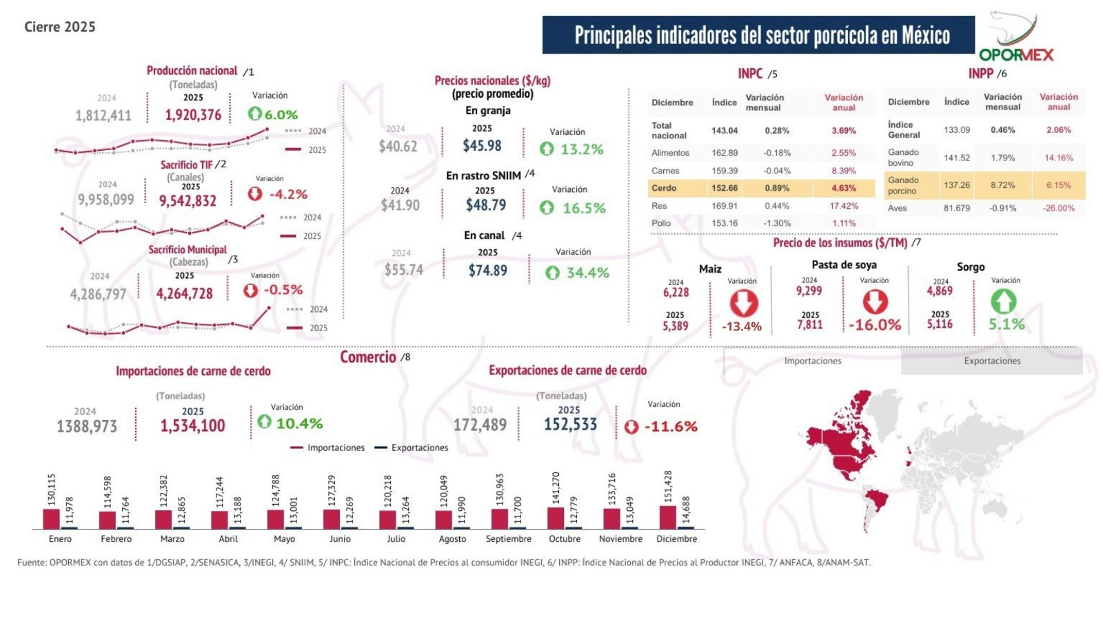 Por su parte, el Índice Nacional de Precios al Consumidor registró una variación anual de 4.63% en la carne de cerdo, mientras que el Índice Nacional de Precios al Productor para el ganado porcino aumentó 6.15%.