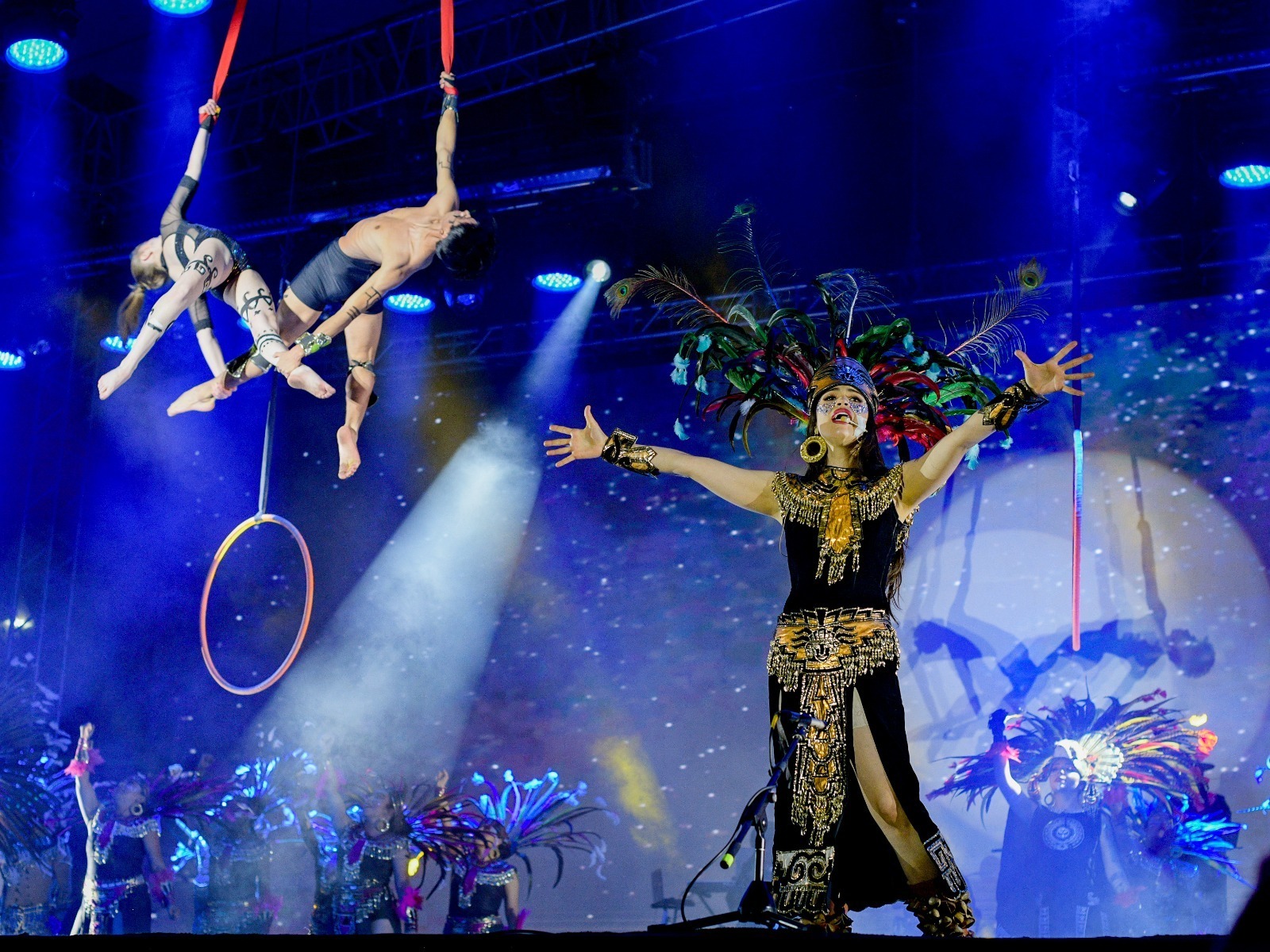 El escenario principal de la Explanada Municipal cautivó al público con la puesta en escena “Entre el cielo y el Mictlán”, una majestuosa producción de arte y folclor dirigida por Aranza Zu López. En esta obra, más de treinta artistas dieron vida a una travesía simbólica entre el mundo terrenal y el inframundo prehispánico, combinando danza, canto, acrobacias y un impresionante juego de imágenes. Cada movimiento evocó las raíces indígenas que conforman la identidad de México, creando una experiencia visual y emocional que celebró la conexión entre la vida, la muerte y la espiritualidad ancestral.