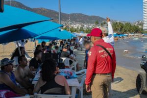 Policías turísticos, la Coordinación de Unidad de Monitoreo Acuático (CUMA) y la División de Rescate Marino recorren distintas playas del puerto, donde mantienen presencia preventiva para brindar información a la población y evitar incidentes.