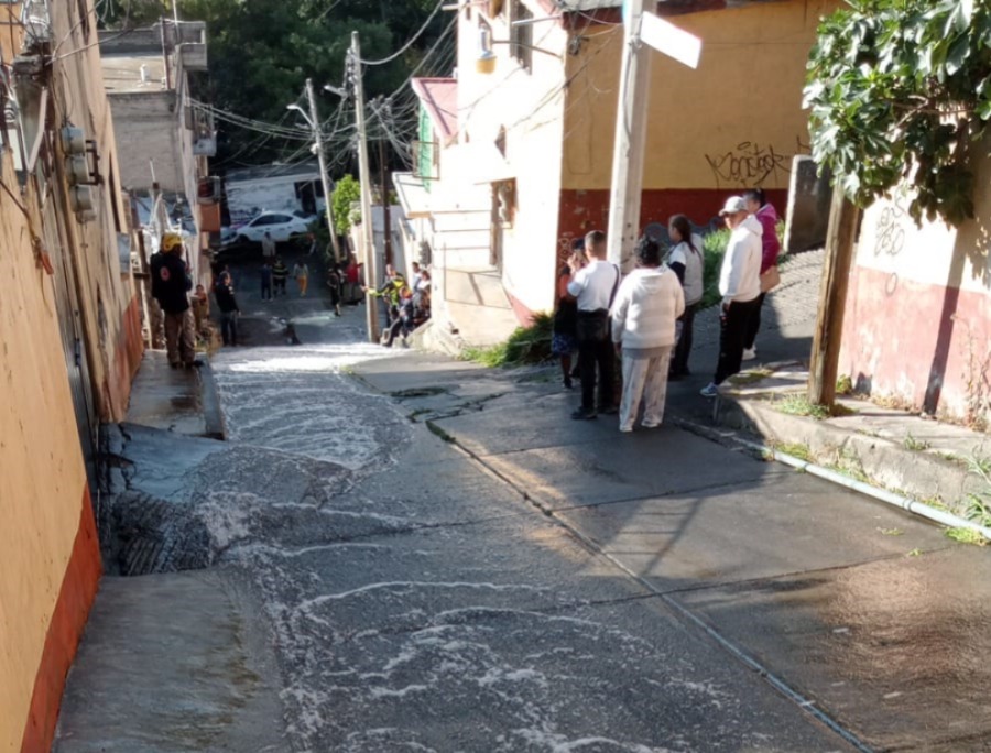 Una fuga de agua provocó una cascada en una calle empinada de la Colonia Torres de Potrero, ubicada en la Alcaldía Álvaro Obregón, entre las calles de Heliotropos y Mercadela.
