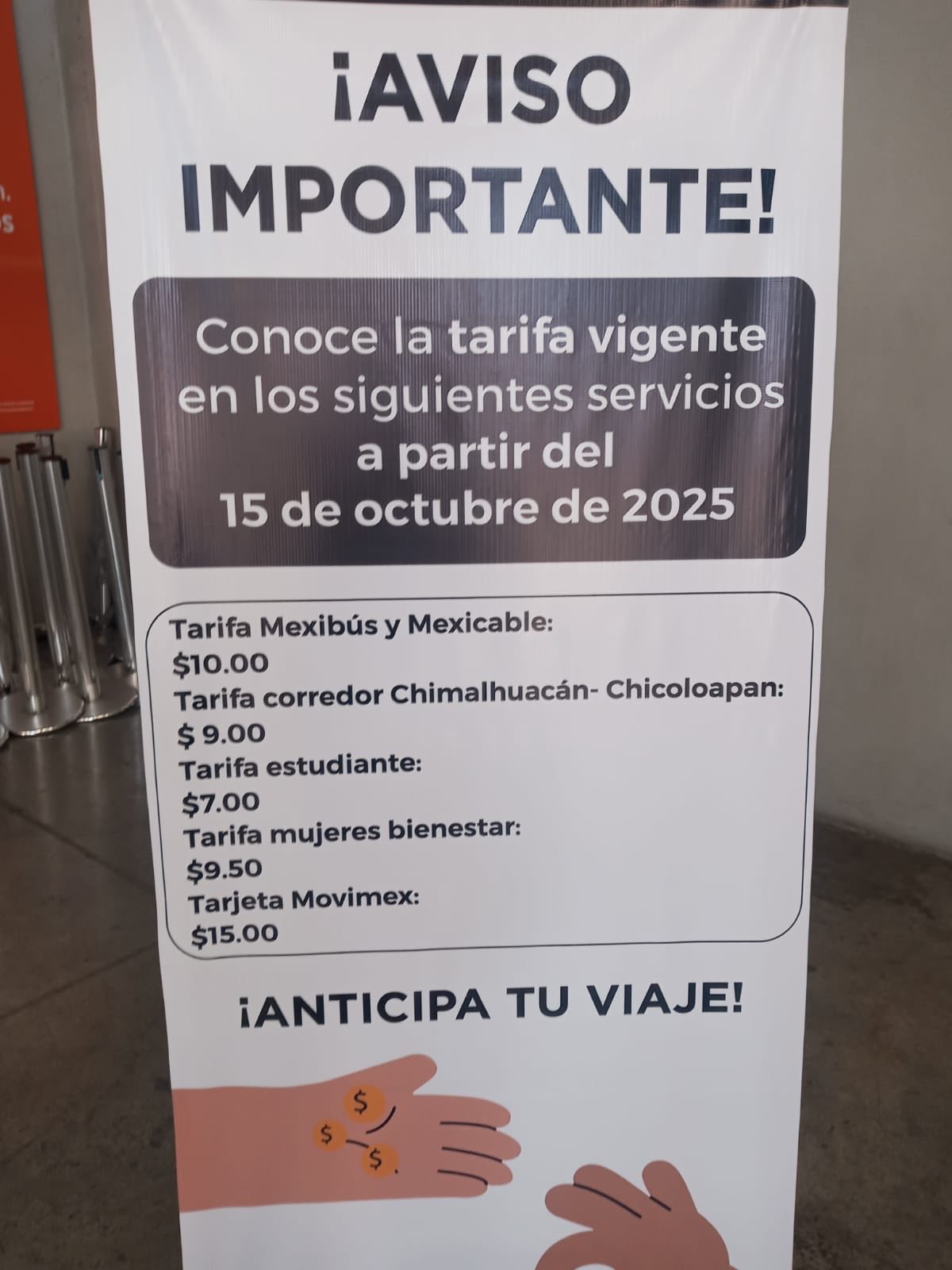 “Conoce la tarifa vigente en los siguientes servicios a partir del 15 de octubre del 2025. Tarifa Mexibús y Mexicable: 10 pesos. Tarifa Corredor Chimalhuacán-Chicoloapan: 9 pesos. Tarifa estudiante: 7 pesos. Tarifa Mujeres Bienestar: 9.50 pesos. Tarifa Movimex: 15 pesos”, señala la lona informativa.