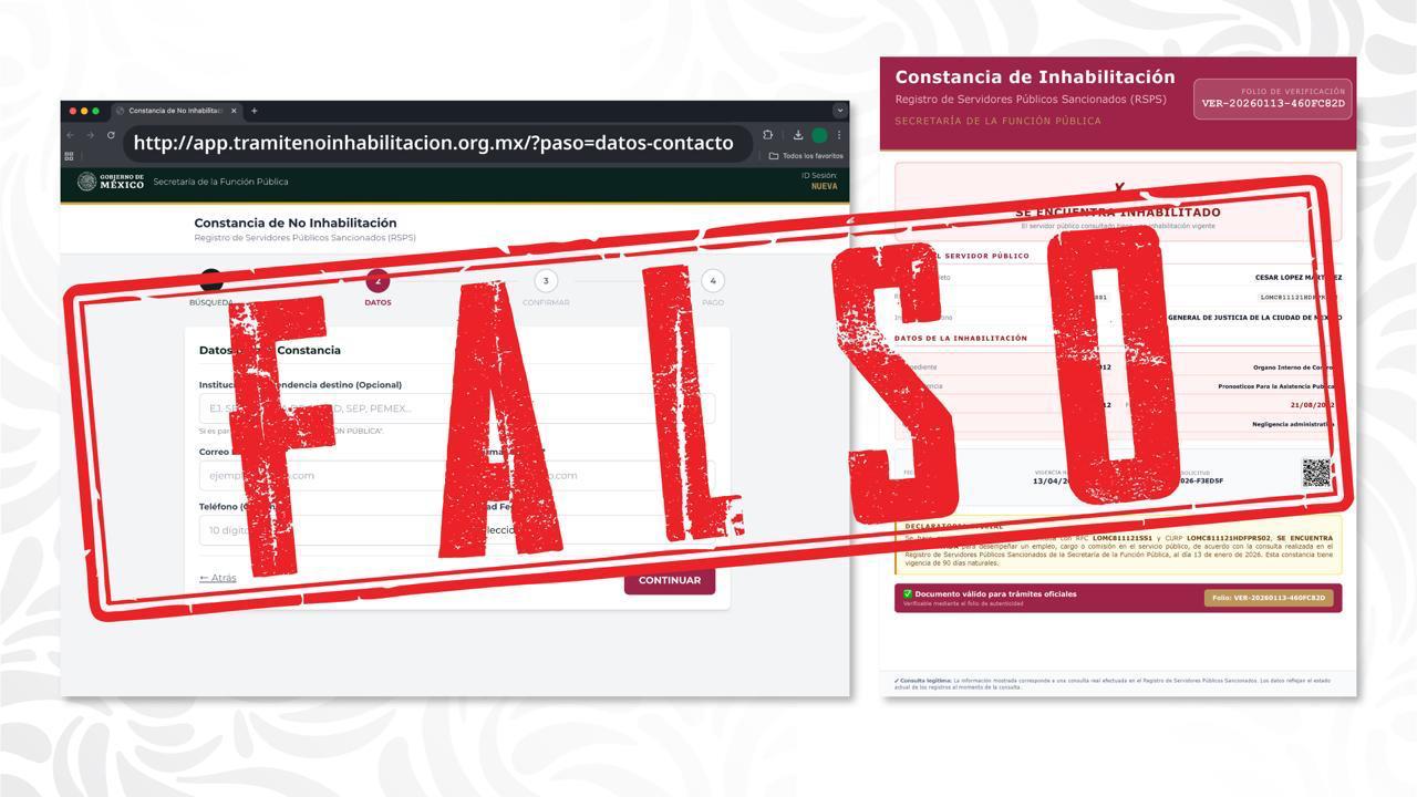 Derivado de denuncias telefónicas por irregularidades en los datos de Constancias de no Inhabilitación, esta Secretaría detectó que la página https://app.tramitenoinhabilitacion.org.mx/?paso=datos-contacto ofrece dicho trámite utilizando logotipos oficiales del Gobierno de México, así como el nombre de la extinta Secretaría de la Función Pública, para simular ser el sitio oficial.