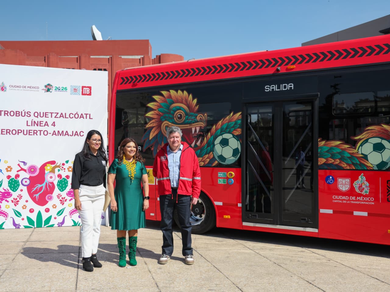 La jefa de Gobierno, Clara Brugada Molina, afirmó que para fortalecer la electromovilidad en la capital del país se pone en marcha la nueva ruta Quetzalcóatl, del Metrobús Línea 4, que llegará de la Glorieta de Amajac (antes Glorieta de Colón) a las terminales 1 y 2 del Aeropuerto Internacional de la Ciudad de México (AICM).