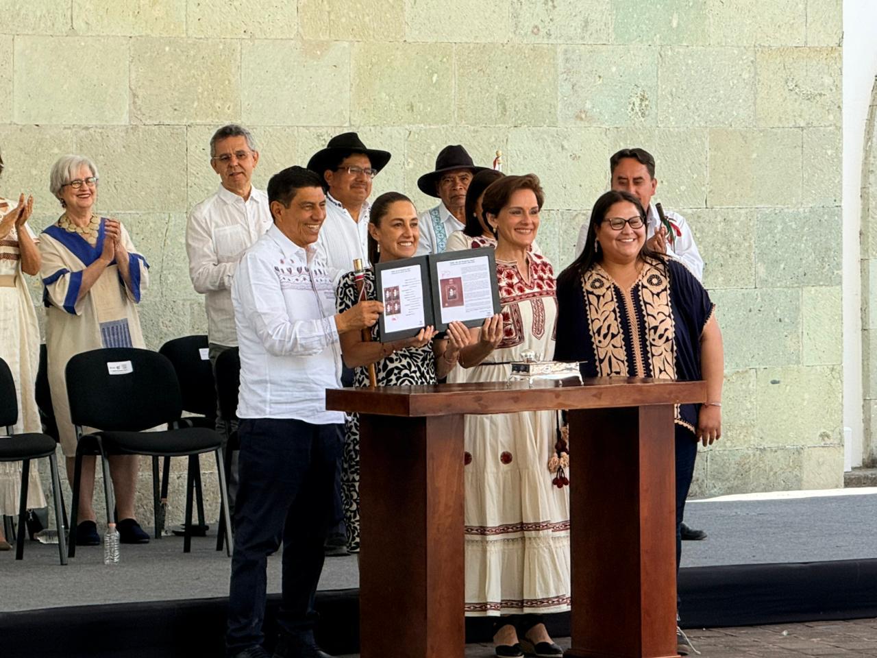Violeta Abreu González, directora de Correos de México, y Citlalli Hernández Mora, secretaria de las Mujeres, atestiguaron la cancelación de los sellos. Al evento también asistió Salomón Jara Cruz, gobernador de Oaxaca, quien acompañó a la presidenta en este acto de justicia histórica.