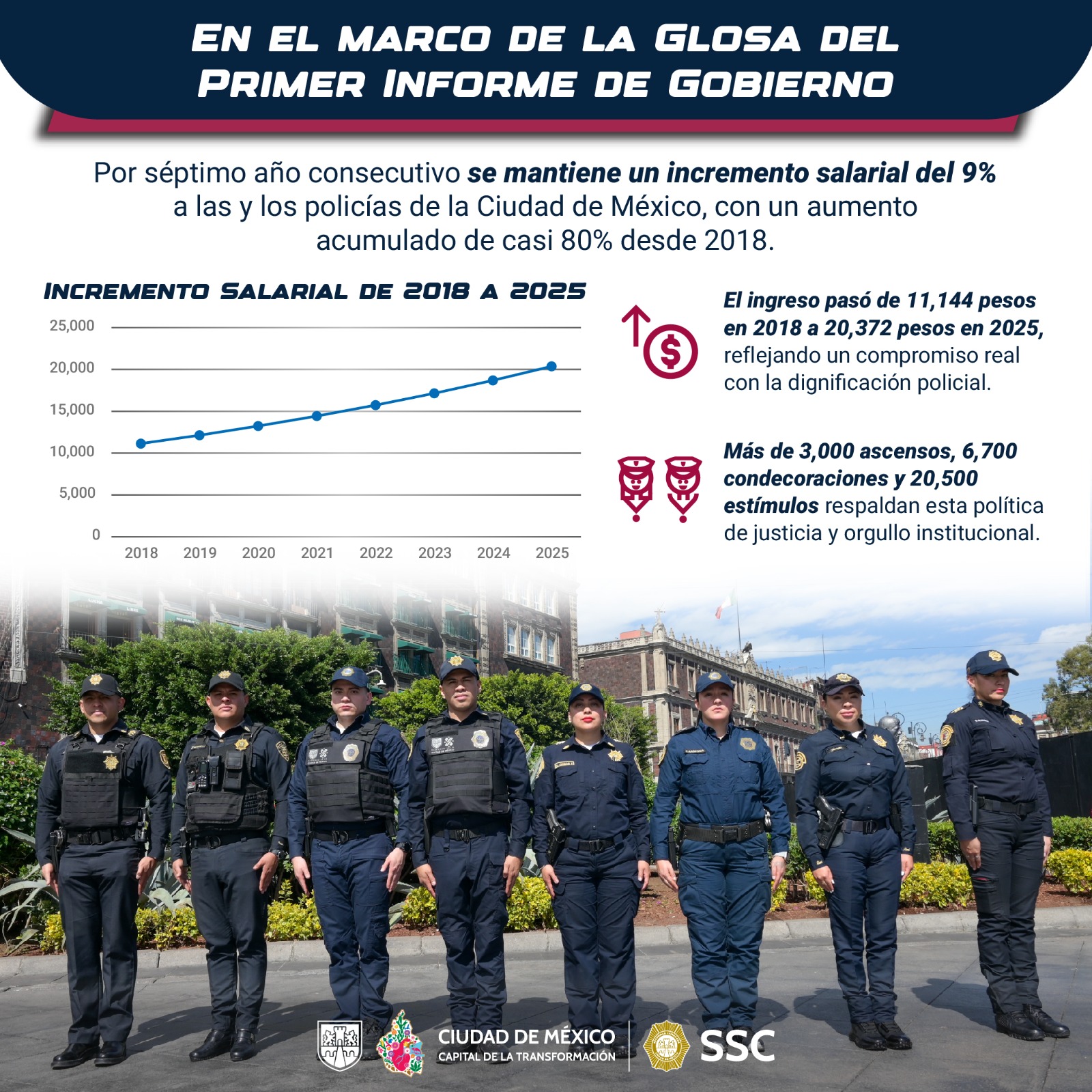 Durante la glosa del Primer Informe de Gobierno de Clara Brugada, el titular de la SSC, Pablo Vázquez Camacho, explicó que desde 2018 el salario promedio pasó de 11 mil 144 pesos a 20 mil 372 pesos, lo que equivale a un aumento acumulado de casi 80 por ciento.