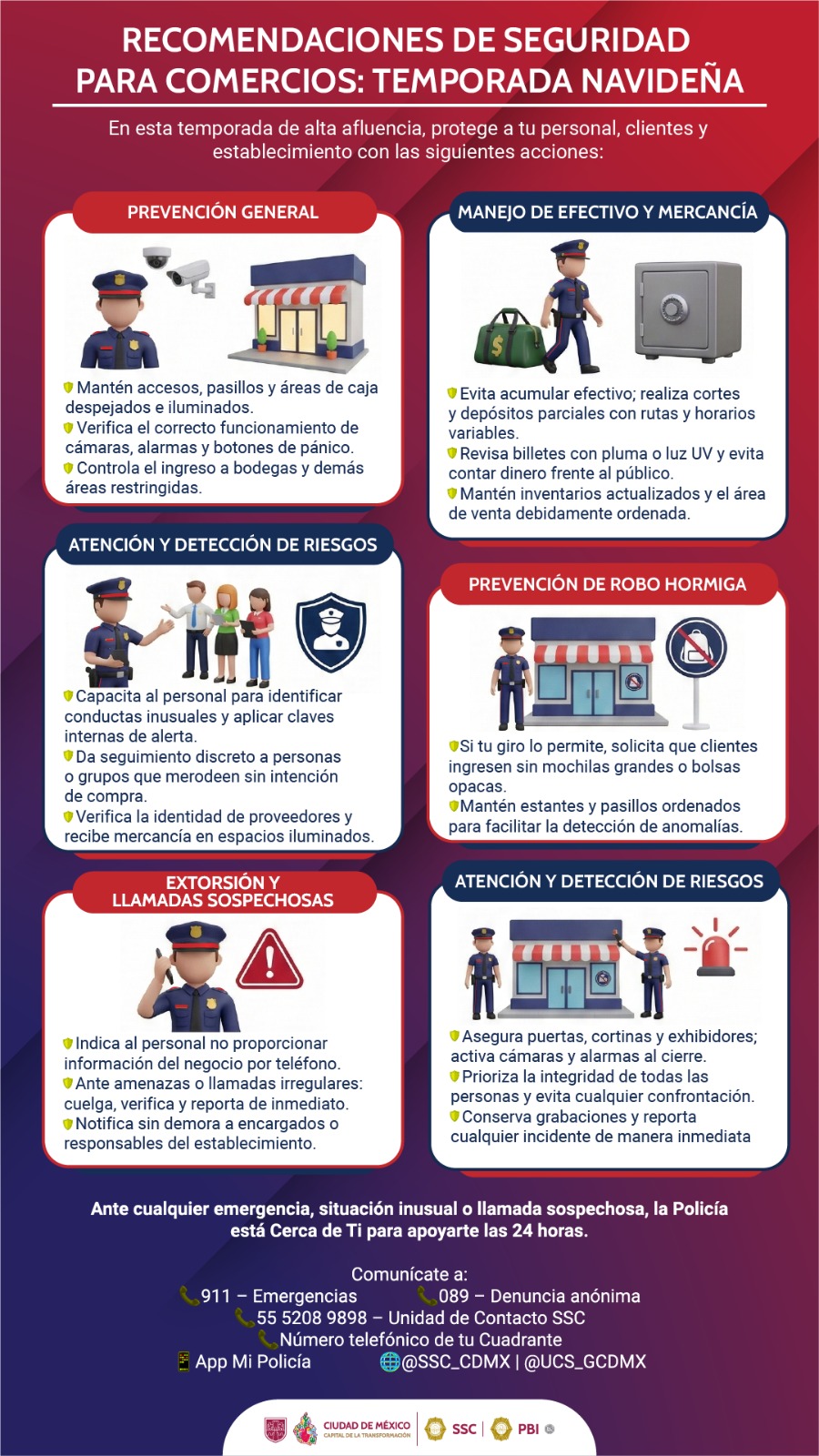 La Secretaría de Seguridad Ciudadana (SSC) de la Ciudad de México, a través de la Policía Bancaria e Industrial (PBI), ante el aumento de actividades comerciales en diciembre, convocó a propietarios, administradores y encargados de establecimientos a adoptar acciones de prevención que contribuyan a proteger al personal, a los clientes y a la mercancía durante este periodo de alta afluencia.