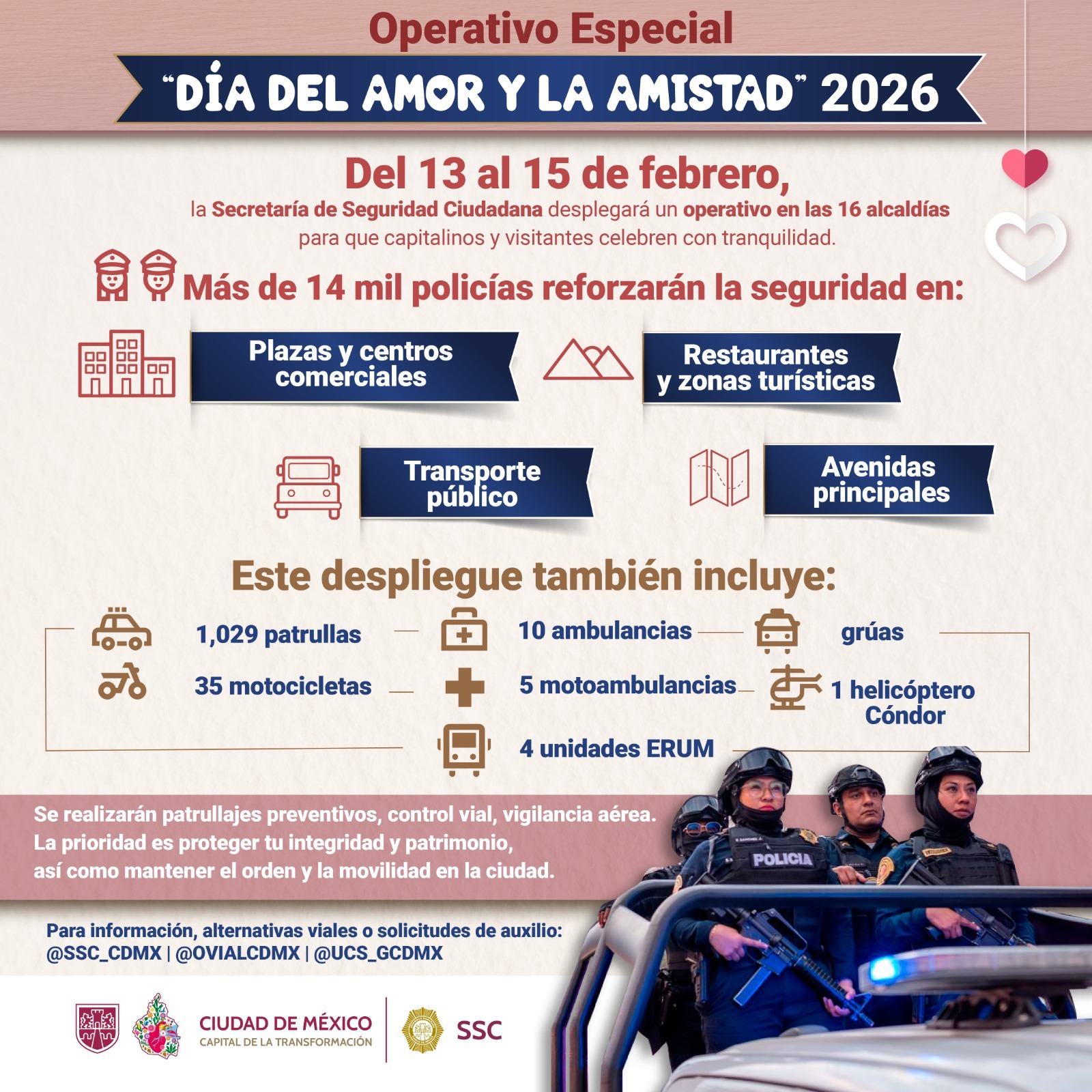 El despliegue operativo, programado del viernes 13 al domingo 15 de febrero, abarcará las 16 alcaldías y contará con la participación de 14 mil 463 policías. Para las labores de seguridad y vialidad se dispondrá de mil 29 vehículos oficiales, 35 motocicletas, tres grúas, 10 ambulancias, cinco motoambulancias y cuatro unidades de rescate del Escuadrón de Rescate y Urgencias Médicas (ERUM).