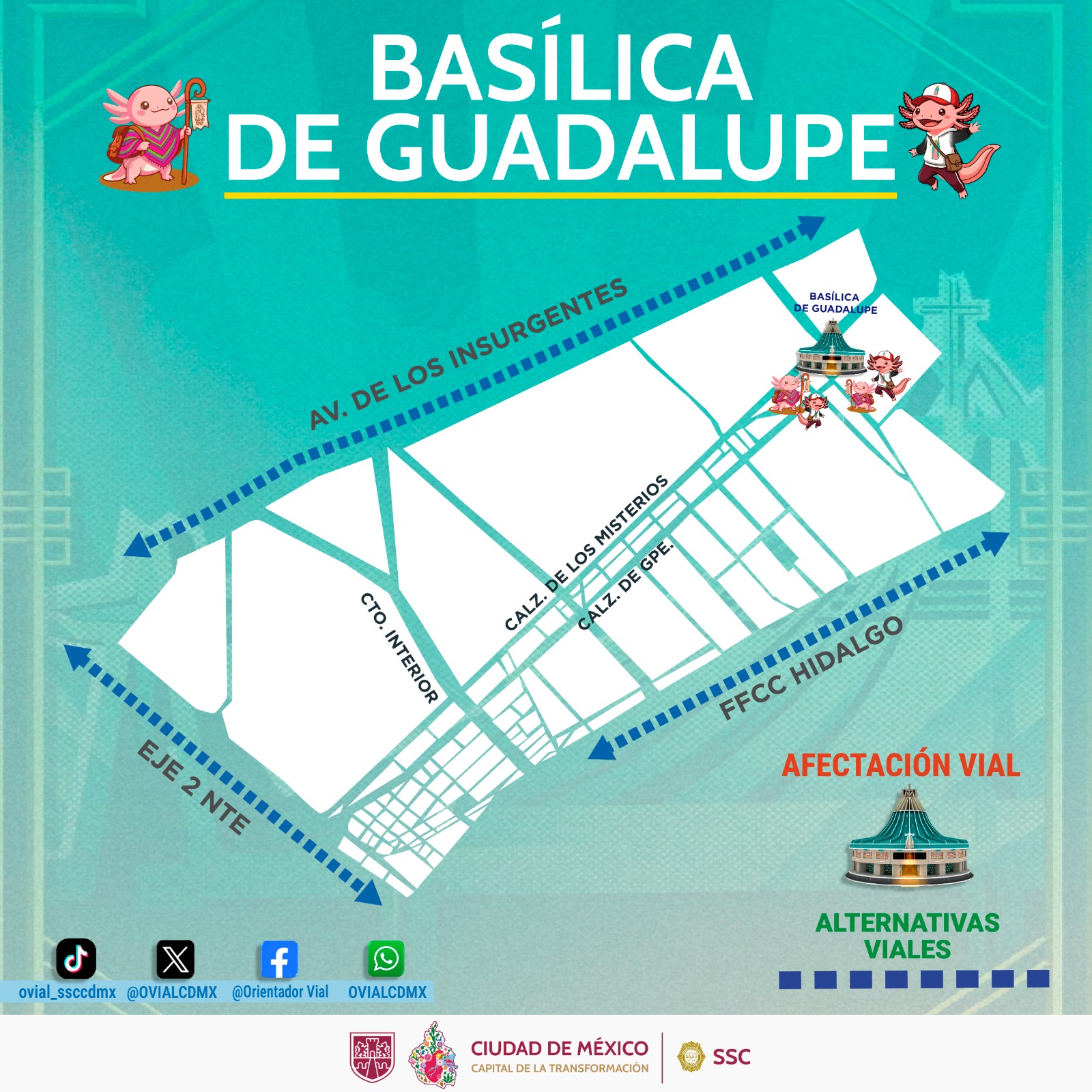 Durante todo el periodo, la Secretaría de Seguridad Ciudadana publicará información actualizada sobre cortes y rutas alternas en las cuentas oficiales de X, Facebook y TikTok tanto de la SSC como del Centro de Orientación Vial (OVIAL) y la Unidad de Contacto del Secretario (UCS).