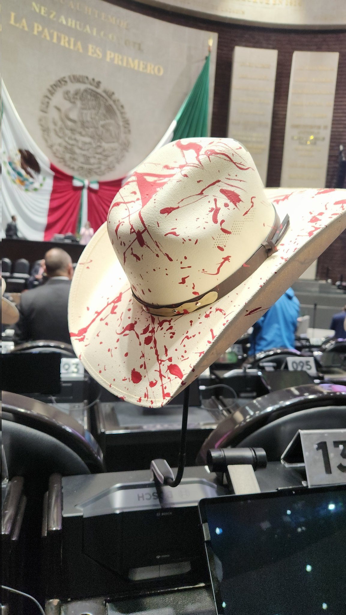 Previo a la sesión ordinaria, las bancadas del PAN y del PRI colocaron sombreros en sus curules, con pintura roja, aparentando sangre, y veladoras de plástico en memoria del presidente municipal.