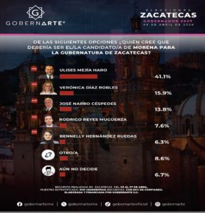 El diputado federal Ulises Mejía Haro mantiene una tendencia ascendente en las preferencias al interior de Morena rumbo a la gubernatura del estado, de acuerdo con la encuesta más reciente de GobernArte.