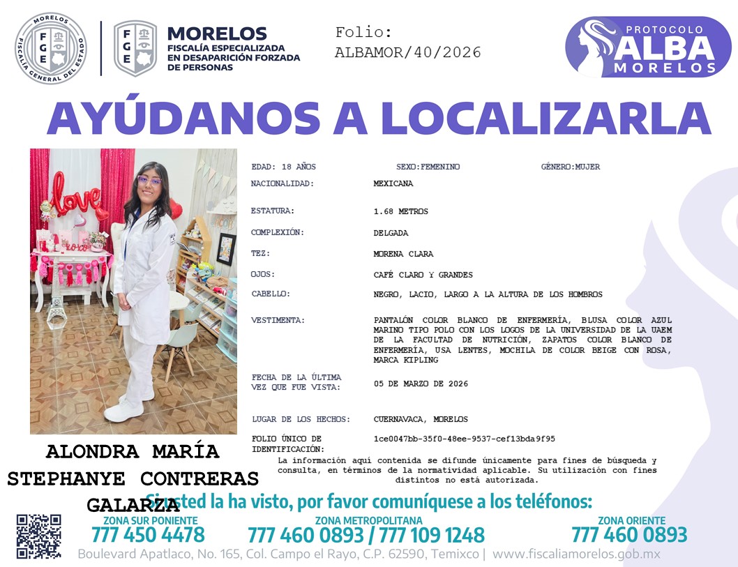 La estudiante de Nutrición, de 18 años, fue vista por última vez el jueves 5 de marzo en Cuernavaca. Su madre ya acudió a la fiscalía; la ficha de búsqueda fue activada hace unos momentos.